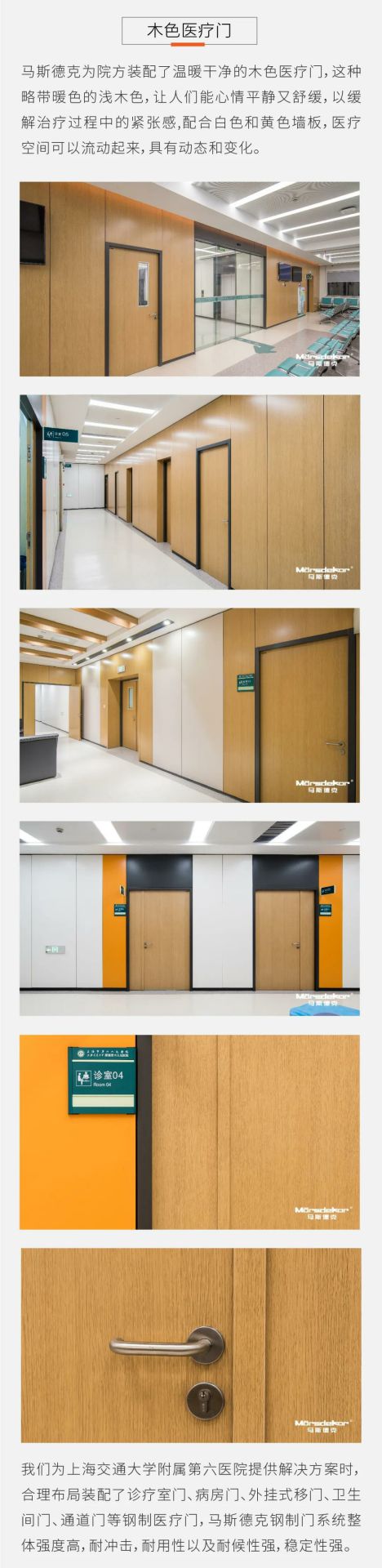 产品种类已覆盖医用钢质门、医用推拉门、室内门、防火门、钢质墙板、钢质空间隔断、金属吊顶等。从接待处到ICU,从化验室到手术室,从病房到行政办公,我们为医院空间环境设计研发多年的产品覆盖各类医院的特定需求..